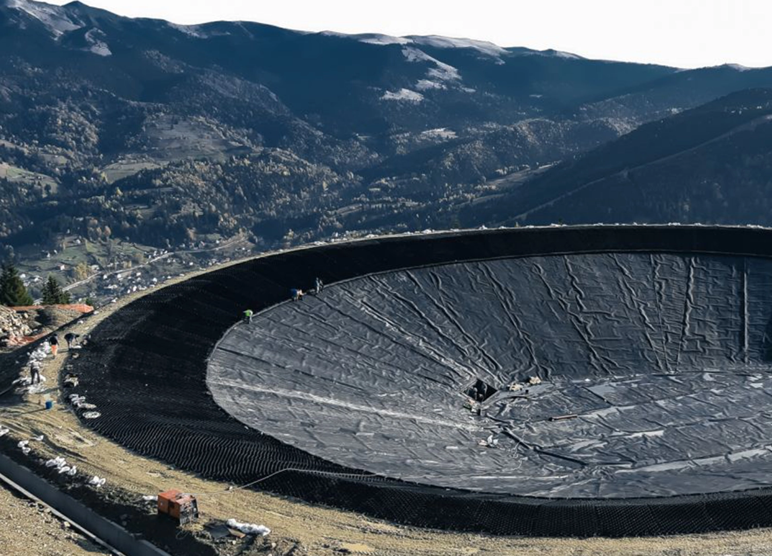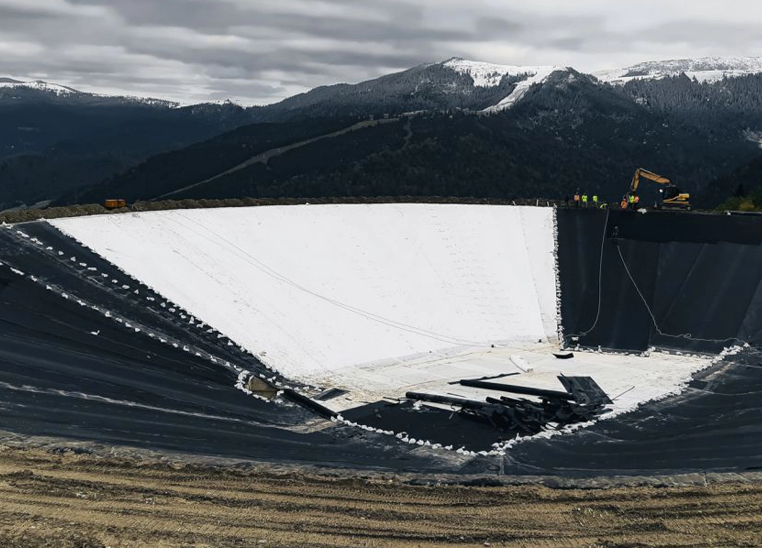 INOVECO a implementat un sistem geosintetic multistrat pentru impermeabilizarea bazinului, utilizand geomembrana GSE® HD de 2 mm, geotextile de protectie, geogrile triaxiale si geocelule pentru stabilizarea stratului de protectie. Solutia tehnica asigura impermeabilitate, stabilitate si durabilitate in conditii montane dificile, caracterizate prin pante accentuate, temperaturi scazute si conditii meteorologice variabile.